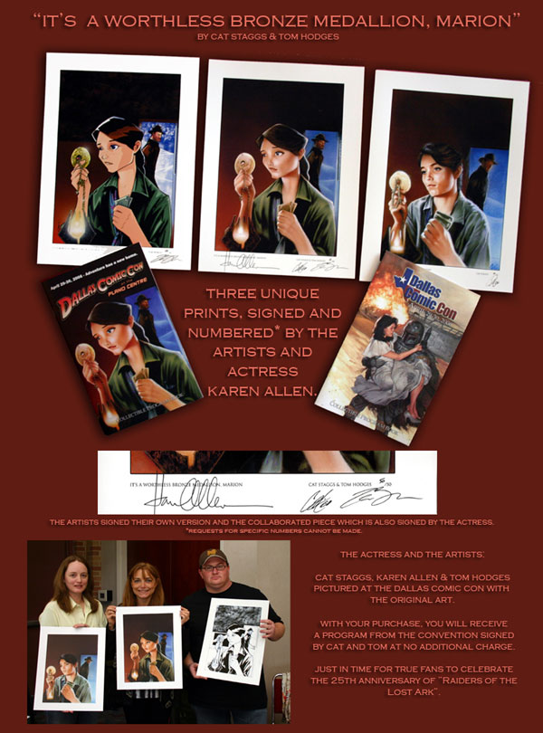 RAIDERS OF THE LOST ARK 25th ANNIVERSARY LIMITED EDITION "MARION" PRINT SET For those of you who missed the Dallas Comic Con 7... shame on you. One of the coolest items available at the show was a limited set of commemorative prints by Lucasfilm artists Tom Hodges (STARWARS.com webstrip artist) and Cat Staggs (Topps STAR WARS sketch card artist). These special numbered print sets were done exclusively for the show, for which Tom and Cat collaborated on a cover for the program book. Now you can get your very own set directly from the artists, and a special bonus they're signed by actress Karen Allen. This year marks the 25th Anniversary of RAIDERS OF THE LOST ARK, and what better way to celebrate than with these awesome collectibles! Here's everything you need to know: